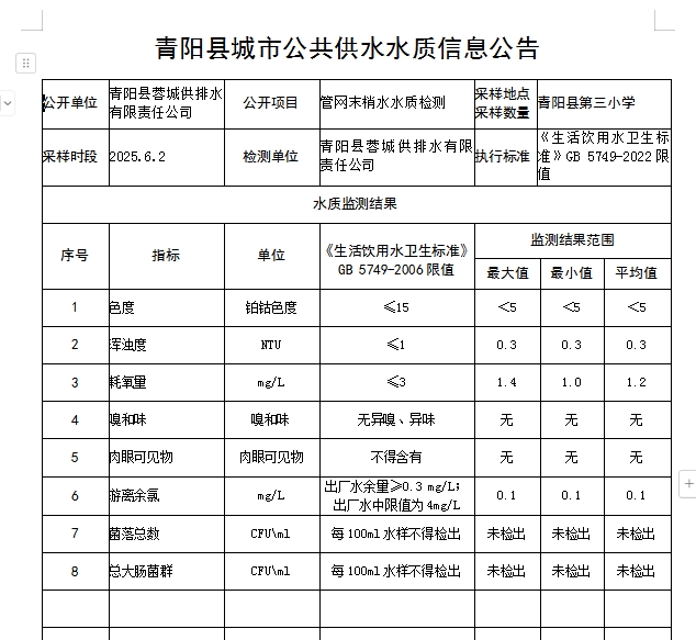 青阳县城市2025年6月2日管网水“8项”半月检指标公示